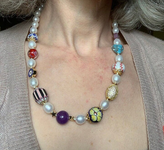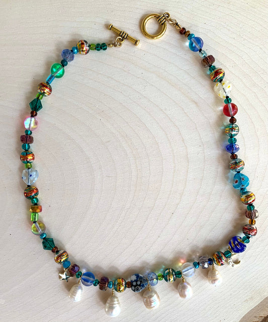Boho Chic Pearl Millefiori Glass Crystal Necklace