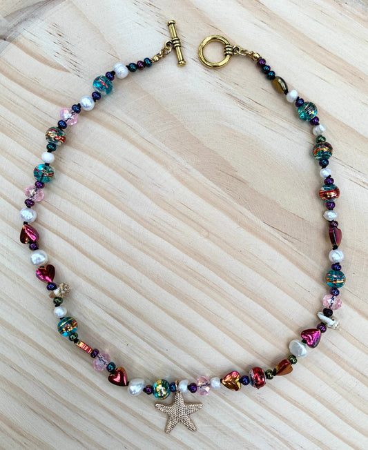 Beachy Boho Chic Pearl & Glass bead, Gold Starfish pendant Necklace