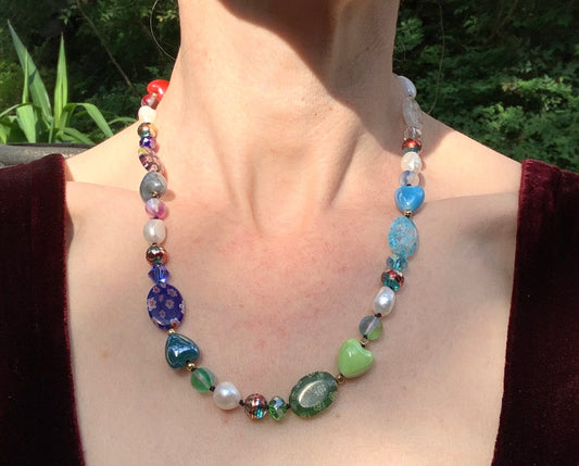 Boho Chic Rainbow Pearl Millefiori Heart and Crystal & Iridescent Glass Necklace